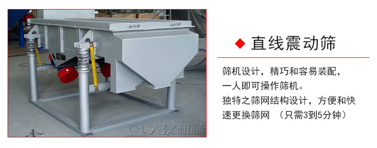 直線震動篩利用振動電機激振作為振動動力來源,使物料在篩網上被拋起,同時向前作直線運動,物料從給料機均勻地進入篩分機的進料口,通過多層篩網產生數種規格的篩上物、篩下物、分別從各自的出口排出。具有耗能低、產量高、結構簡單、易維修、全封閉結構,無粉塵溢散,自動排料,更適合于流水線作業。