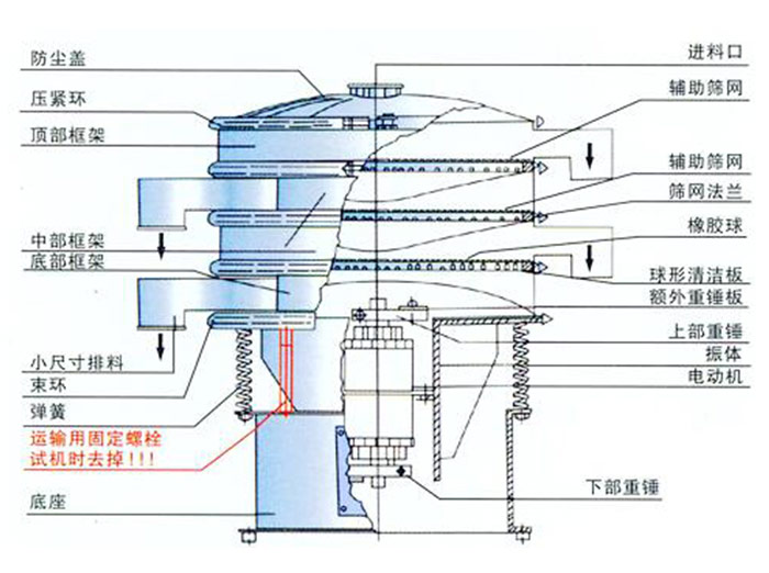 由直立式電機作激振源,電機上、下兩端安裝有偏心重錘,將電機的旋轉運動轉變為水平、垂直、傾斜的三次元運動,再把這個運動傳遞至地面。調節上、下兩端的相位角,可以改變物料在篩面上的運動軌跡。