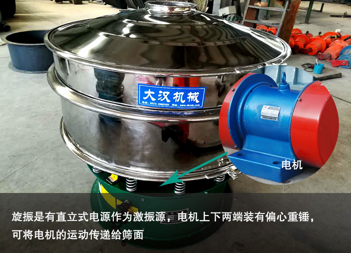 旋振是有直立式電源作為激振源,電機(jī)上下兩端裝有偏心重錘,可將電機(jī)的運(yùn)動(dòng)傳遞給篩面,使物料在篩面上進(jìn)行運(yùn)動(dòng)以達(dá)到篩分效果的,篩分過程就被稱之為旋振篩。其篩分機(jī)可使用多層篩分的方式其能達(dá)到3-5層的篩分。