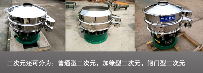 三次元振動(dòng)篩是一種高精度細(xì)粉篩分設(shè)備,適用于粒,粉,粘液等物料的篩分。而三次元振動(dòng)篩其工作原理于旋振篩大致相同,其不同的是三次元還可分為:普通型三次元,閘門型三次元,加緣型三次元。此振動(dòng)篩也可以多層篩分。