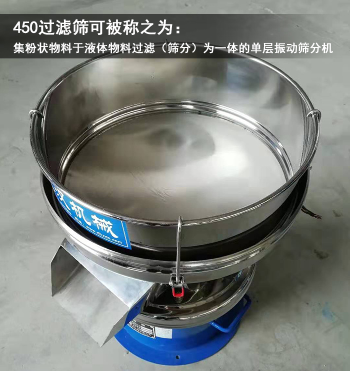 要問450過濾篩還在那里,其450過濾篩過濾篩又叫過濾篩分機,所以它還具有篩分的作用,從結構名稱可以得出其還可以篩分粉狀物料,所以450過濾篩可被稱之為:集粉狀物料于液體物料過濾(篩分)為一體的單層振動篩分機。這也就是過濾篩相對于其它振動篩分機的大優勢于特點。